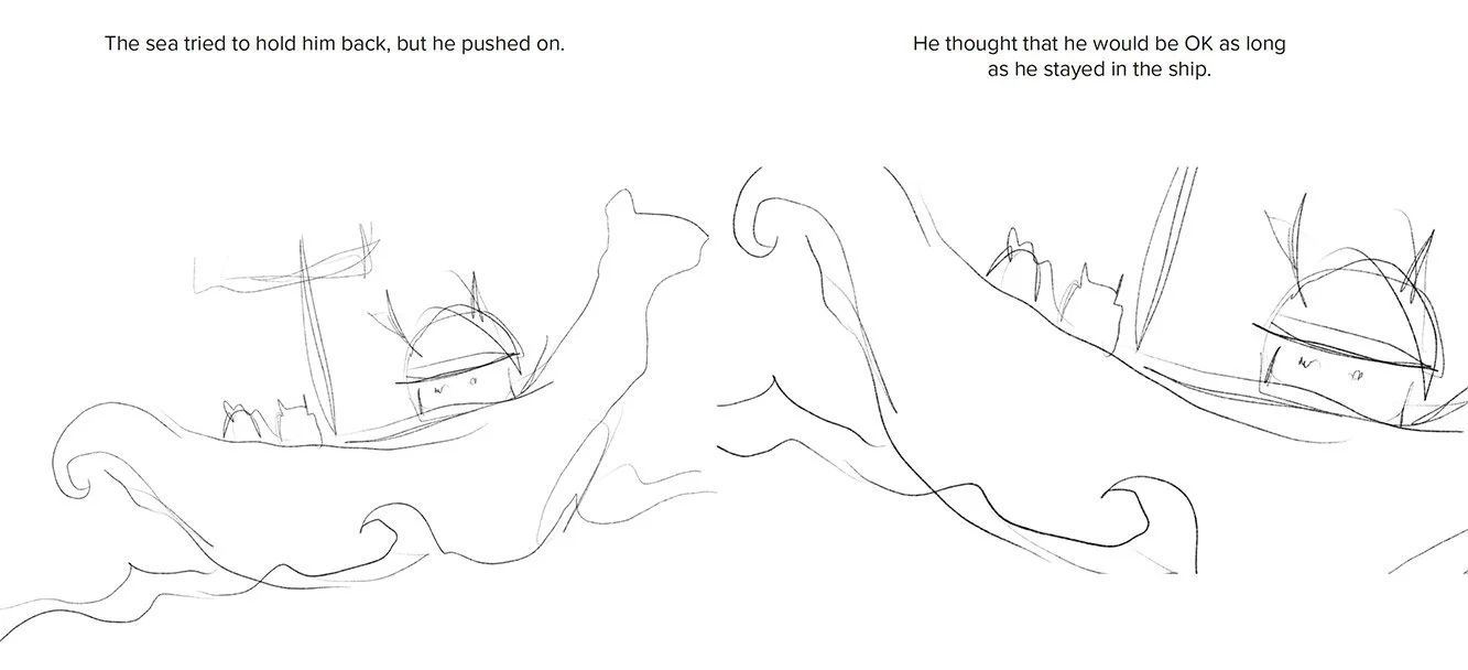 As you can see, Stig originally found an abandoned ship and the floatie didn’t appear until a later revision. My editor, Tracy Gates, felt that finding a ship was “too easy” and that we should make things a little more difficult for Stig. It was definitely the right call.
